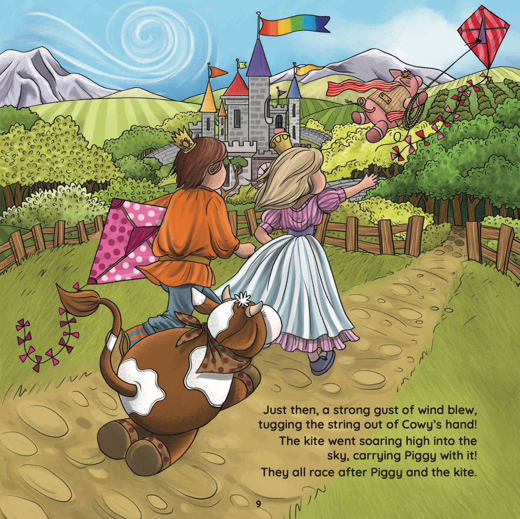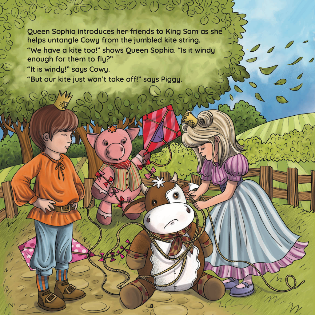 Together as Queen Sophia and King Sam, they join Piggy and Cowy on a daring rescue adventure full of soaring kites, a hot-air balloon, and one very bouncy trampoline.